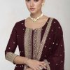 Maroon front slit embroidered palazzo suit made with thread zari, and sequin work. Comes with matching georgette top, bottom and dupatta.