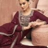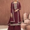 Maroon georgette embroidered palazzo pant suit made with thread zari work. Comes with matching top, bottom and dupatta.