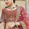 Maroon silk bridal lehenga choli, designed with sequin, zari work, hand embroidered paired with matching embroidered blouse and net dupatta.