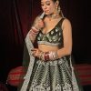 This will fit bust and waist sizes 32,34,36,38,40,42 (UK sizes 6-16). Top length 13-14” max. Lehenga length 42” max. Slight variation in colour is possible. Model accessories and latkans not included.