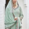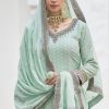 Mint Green palazzo Salwar suit with resham work and patch border with touch up patterns on the yoke and lower part of the kameez. Set includes top, bottom and dupatta.