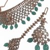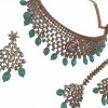 Mint Green SURI American Diamond Necklace Set. Gold based finish filled with american diamond with mint green pearl drop hanging beads. These earrings with set are for pierced ears only.