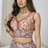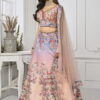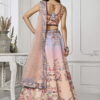 Multi colour satin silk wedding lehenga choli designed with digital print and intricate swarovski crystals on the lehenga. The outfit comes with a lehenga, choli and a soft net dupatta.