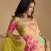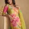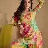 Multicolour chinon floral print sharara suit made with thread zari sequin work. Comes with matching top, bottom and dupatta.