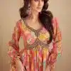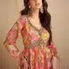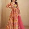 Multicoloured chinon digital print Anarkali gown, made with sequence and embroidered work. Comes with matching top and net dupatta. Does not come with trouser.