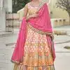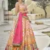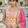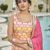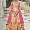 Multicoloured digital print fancy silk anarkali gown, made with handwork embroidery at neck. Comes with matching top and dupatta. Does not come with trouser.