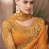 Mustard embroidered border party wear saree, made with intricate embroidery border work. The saree comes with a matching blouse.