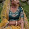 Mustard silk bridal lehenga choli, designed with sequin, zari work, hand embroidered paired with matching embroidered blouse and silk dupatta.
