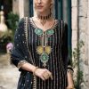 Navy chinon embroidered palazzo suit, made with thread and sequin work at front and back of the kameez and pant. Includes top, bottom and dupatta.