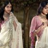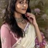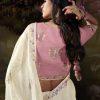Off White embroidered wedding saree, embellished with sequin stone and thread work enhanced by fancy tassels. The saree comes with a matching contrast blouse.