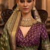 Olive rajwadi silk embroidered lehenga choli crafted with royal themed print, stone and zari work. Comes with matching purple lehenga choli and olive dupatta.