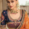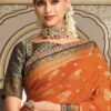 Orange art silk embroidered wedding saree, designed with thread, zari work enhanced by fancy lace border. The saree comes with a contrast matching double blouse.