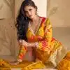 Orange chinon floral print sharara suit made with thread zari sequin work. Comes with matching top, bottom and dupatta.