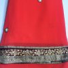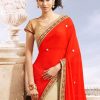 Orange Red Tone And Beige Georgette Saree, embroidered with pearl buti work comes with matching unstitched plain gold matti blouse piece.