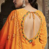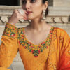 Orange yellow embroidered anarkali suit made with thread and patch border work. Comes with matching top and dupatta.