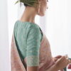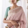 Pale pink kora silk wedding saree, designed with minakari, zari work enhanced by stone embroidery and tassels. The saree comes with a contrast green matching blouse.