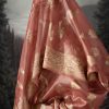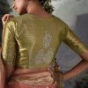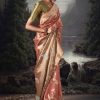 Peach embroidered banarasi wedding saree, embellished with swarovski stone and thread work enhanced by fancy tassels. The saree comes with a matching blouse.