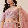 Peach embroidered net lehenga choli made with slub georgette with sequins work. Comes with matching lehenga choli and dupatta.