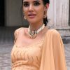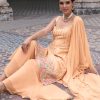 Peach embroidered party wear sharara suit made with thread zari, and sequin work. Comes with matching top, bottom and dupatta.