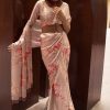 Peach floral print satin crepe saree crafted with all over print design. The saree comes with a matching unstitched blouse.