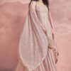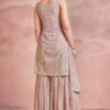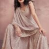 Peach georgette embroidered sharara suit crafted with thread and sequins work. Comes with Top, bottom & dupatta.