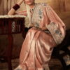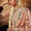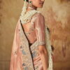 Peach kanjivaram silk wedding saree, designed with minakari, zari work enhanced by stone embroidery and tassels. The saree comes with a contrast green matching blouse.