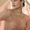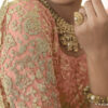 Peach Net Sangeet Lehenga Choli, designed with floral print, sequin, zari work embroidered paired with matching embroidered blouse and dupatta.