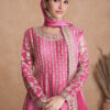 Pink chinon embroidered palazzo suit, made with resham work and patch border with touch up patterns on the yoke and lower part of the kameez. Includes top, bottom and dupatta.