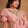 Pink crepe georgette silk ruffled designer saree crafted with sequin and cord embroidery work. The saree comes with a unstitched matching blouse.