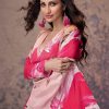 Pink crepe silk jacket style palazzo with crop top, made with thread zari sequin work. Comes with matching top, pant and jacket.
