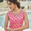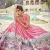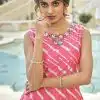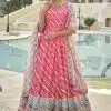 Pink digital print fancy silk anarkali gown, made with handwork embroidery at neck. Comes with matching top and dupatta. Does not come with trouser.