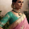 Pink dola silk wedding saree, designed with thread, zari work enhanced by fancy lace border. The saree comes with a contrast matching blouse.