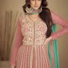 Pink embroidered palazzo suit made with thread zari, and sequin work. Comes with matching top, bottom and dupatta.