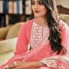 Pink georgette anarkali palazzo suit with resham work and patch border with touch up patterns on the yoke and lower part of the kameez. Set includes top, bottom and dupatta.