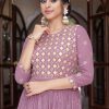Pink georgette anarkali suit, made with thread work and patch border with touch up patterns on the yoke and lower part of the kameez. Set includes top, bottom and dupatta.