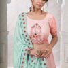 This will fit bust and waist sizes 32,34,36,38,40,42 (UK sizes 6-16). Top length 13-14” max. Lehenga length 42” max. Slight variation in colour is possible. Model accessories and latkans not included.