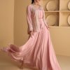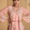 Pink palazzo suit with crop top & jacket, made with thread zari, and sequin work. Comes with matching top, bottom and jacket.