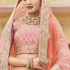 Pink silk bridal lehenga choli, designed with sequin, zari work, hand embroidered paired with matching embroidered blouse and net dupatta.