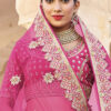 Pink silk bridal lehenga choli, designed with sequin, zari work, hand embroidered paired with matching embroidered blouse and net dupatta.