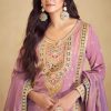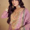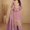 Pink simar silk embroidered palazzo suit made with thread zari, and sequin work. Comes with matching top, bottom and dupatta.