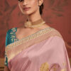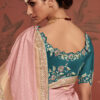 Pink soft dola silk wedding saree, designed with thread, zari work enhanced by fancy lace border. The saree comes with a contrast matching blouse.