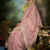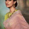 Pink tissue silk wedding saree, designed with thread, zari work enhanced by stone embroidery. The saree comes with a contrast green matching blouse.