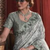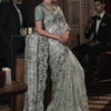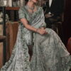 Pista half n half bridal party saree designed with hand made flowers and heavy sequence work. The saree comes with a matching art silk blouse.