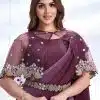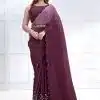 Plum crepe satin silk designer saree crafted with sequin and cord embroidery work. The saree comes with a unstitched matching blouse.