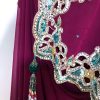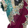 Plum georgette saree embroidery designed with, Zari, resham, booti, sequin embroidery cutwork and patch border work. The saree comes with a readymade blouse.