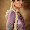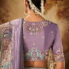 Purple kanjivaram silk wedding saree, designed with minakari, zari work enhanced by stone embroidery and tassels. The saree comes with a contrast green matching blouse.