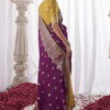Purple kora silk wedding saree, designed with minakari, zari work enhanced by stone embroidery and tassels. The saree comes with a contrast green matching blouse.