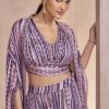 Purple palazzo suit with crop top & shrug, made with thread zari, and sequin work. Comes with matching top, bottom and shrug.
