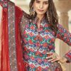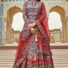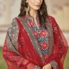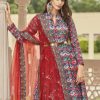 Red digital print anarkali gown, made with handwork embroidery. Comes with matching top and net dupatta. Does not come with trouser.