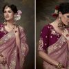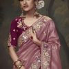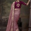 Rose pink embroidered wedding saree, embellished with sequin stone and thread work enhanced by fancy tassels. The saree comes with a matching contrast blouse.